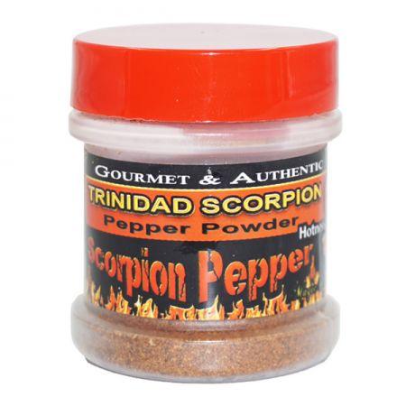 Trinidad Scorpion Pepper Powder - 1/2oz in a plastic Jar with sifter lid. The original Trinidad Scorpion pepper with an AMAZING Hot flavor that will kick your tongue. In 2011 Guinness book of world records confirmed the Trinidad Scorpion Pepper is the hottest chili pepper in the world! WOW IT'S SO HOOOOT!!!